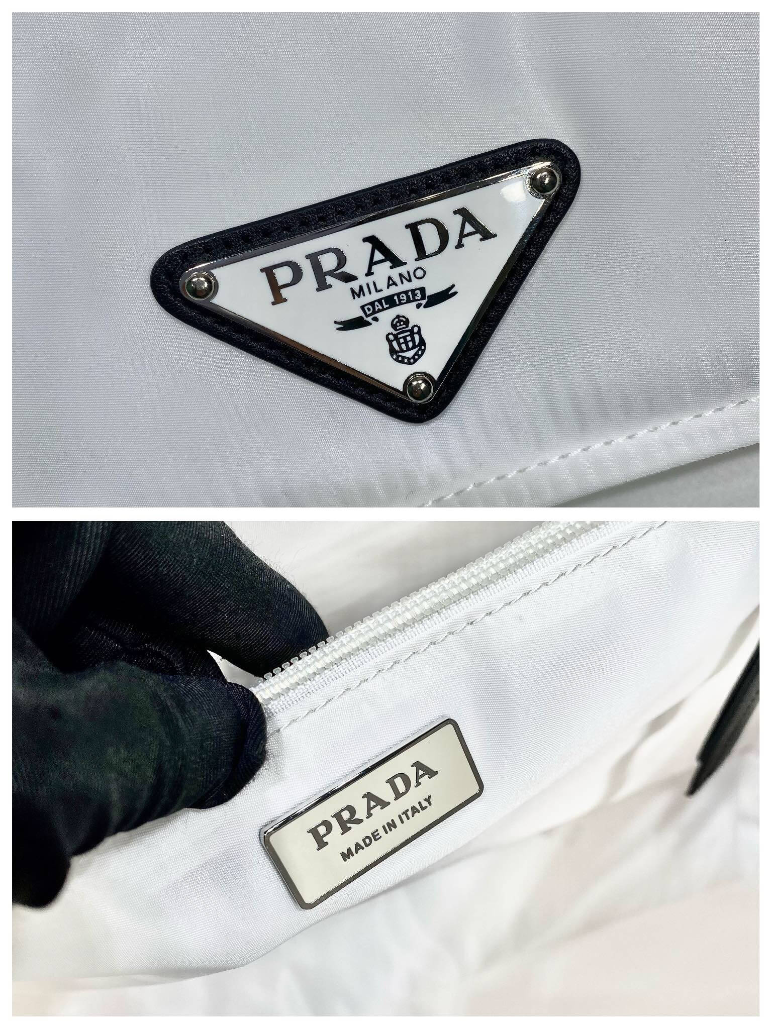 - Enameled metal triangle logo on the flap
