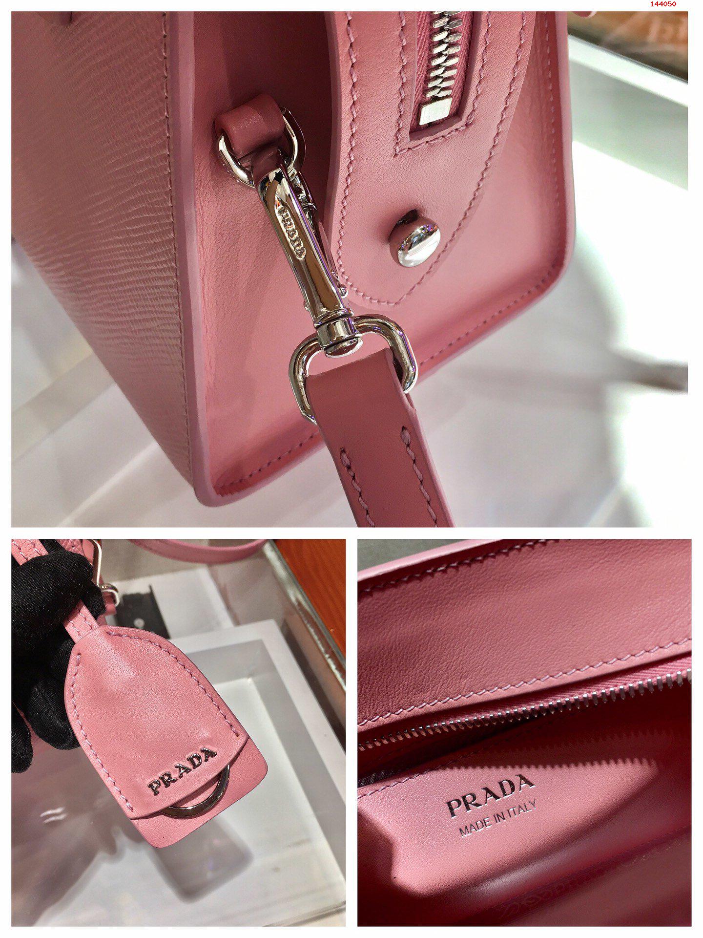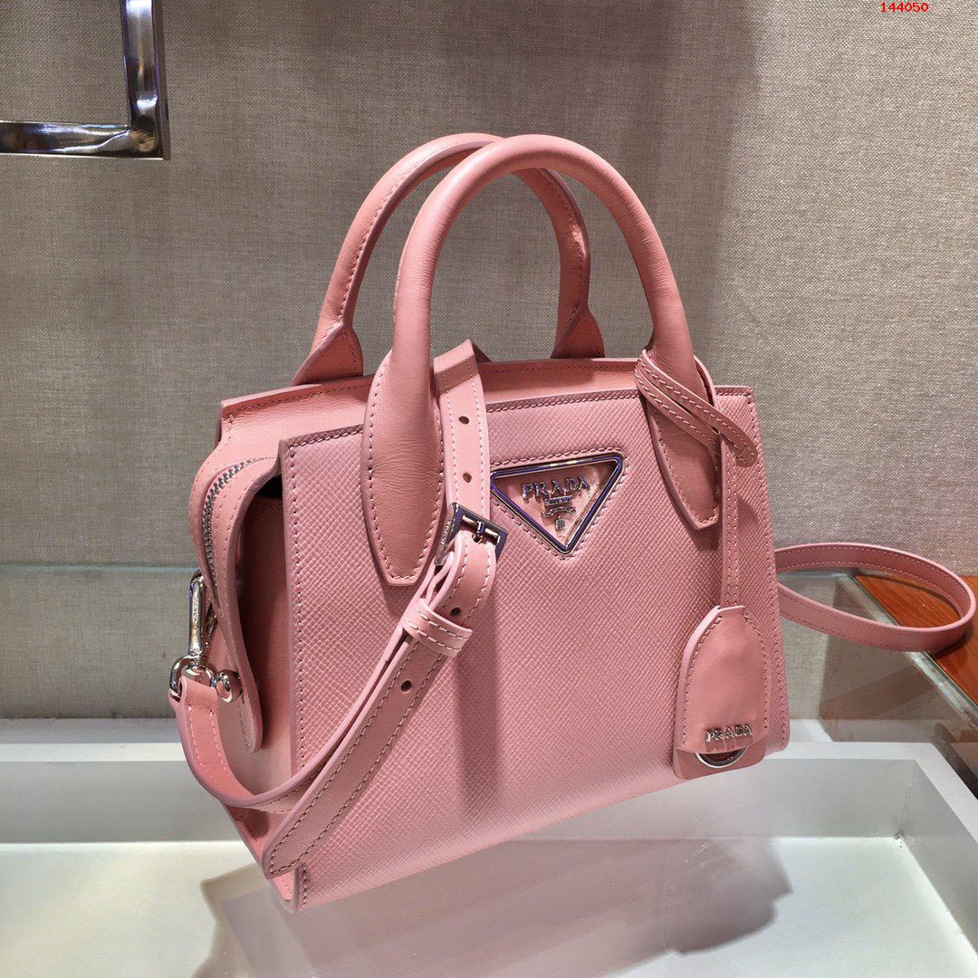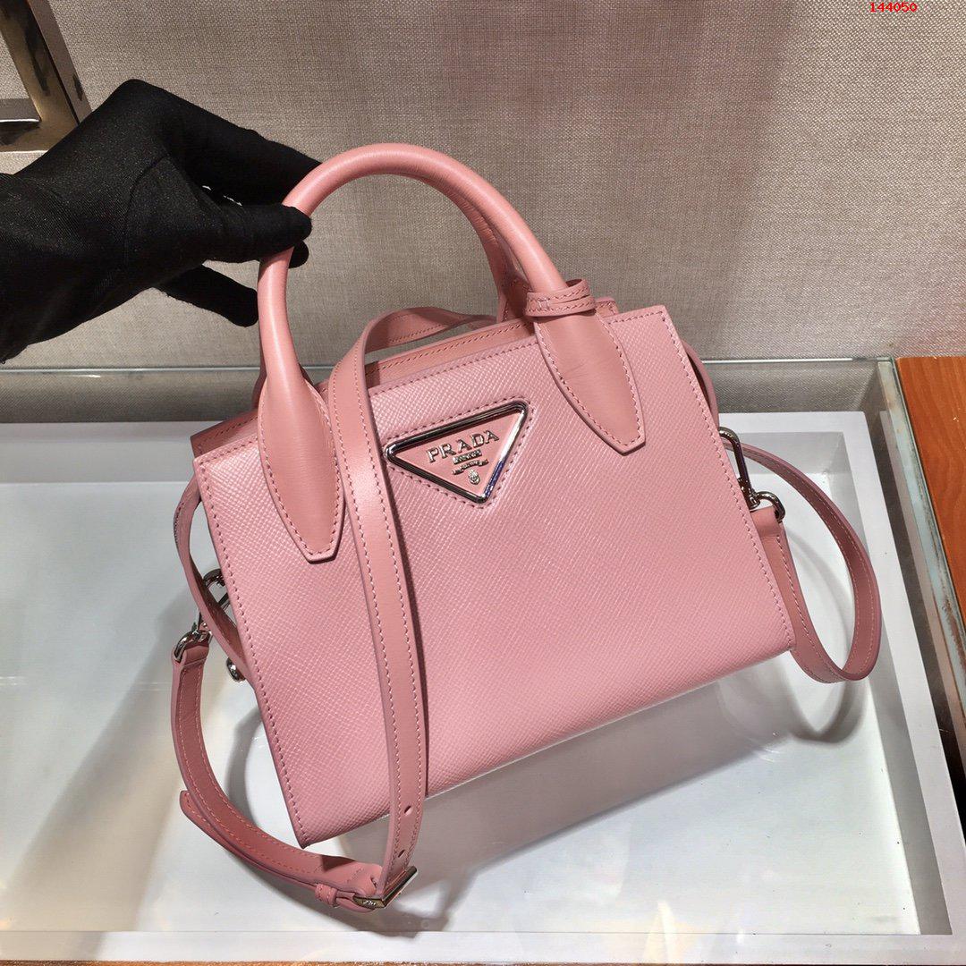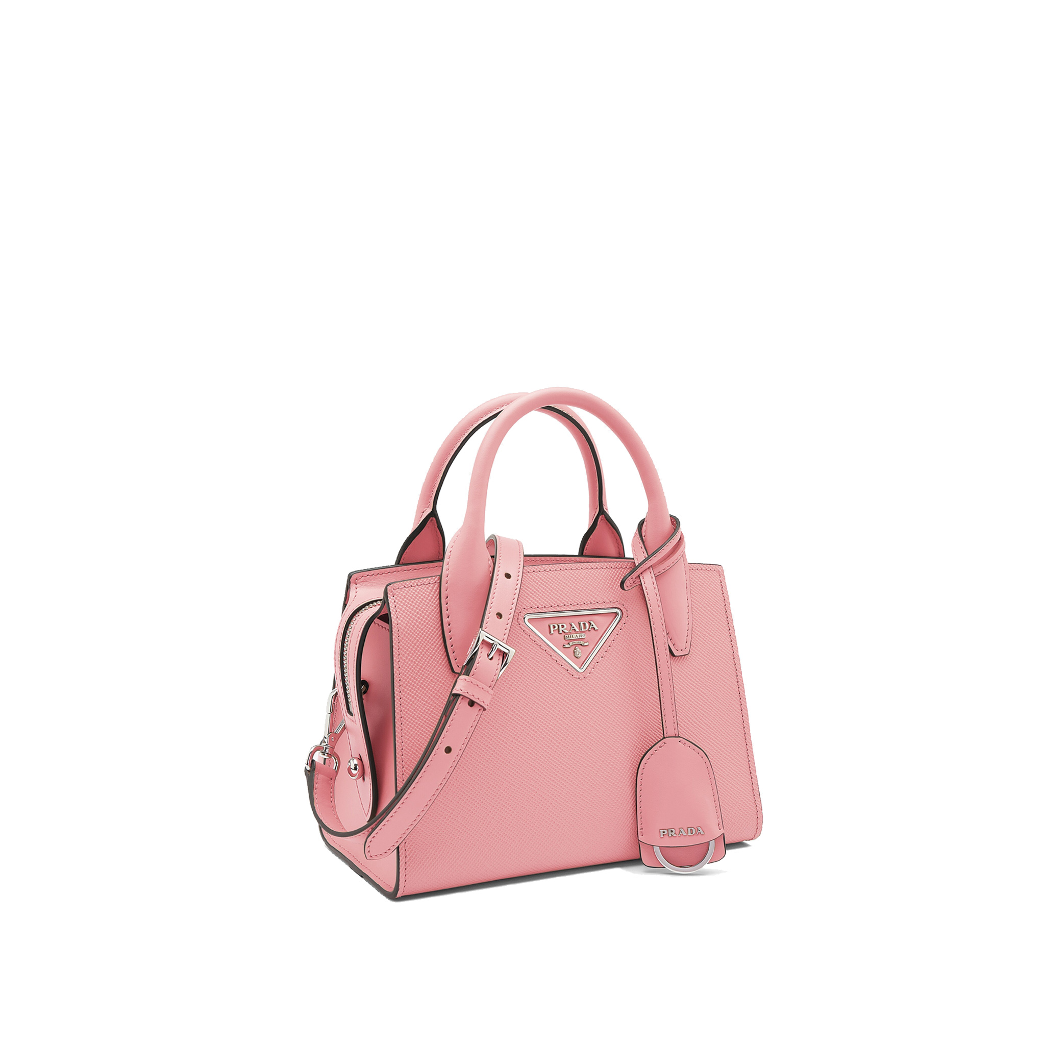 This Saffiano leather handbag with structured silhouette stands out for its sophisticated details that embellish it. The triangle logo decorates the bag.
