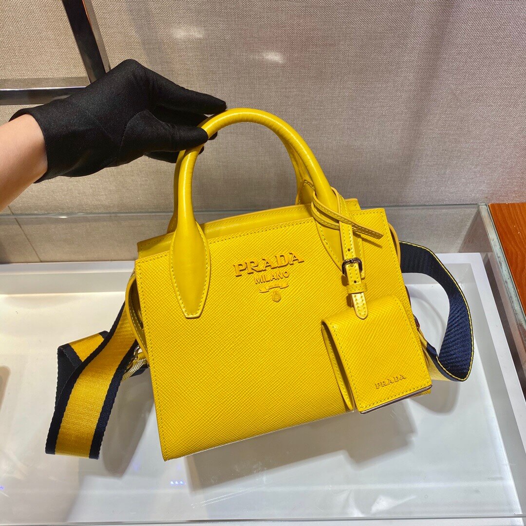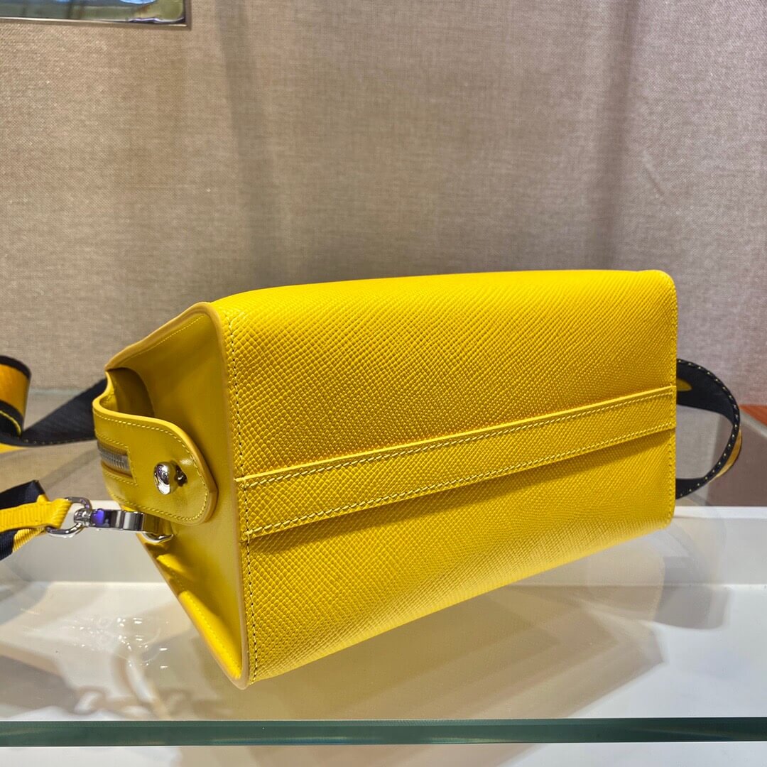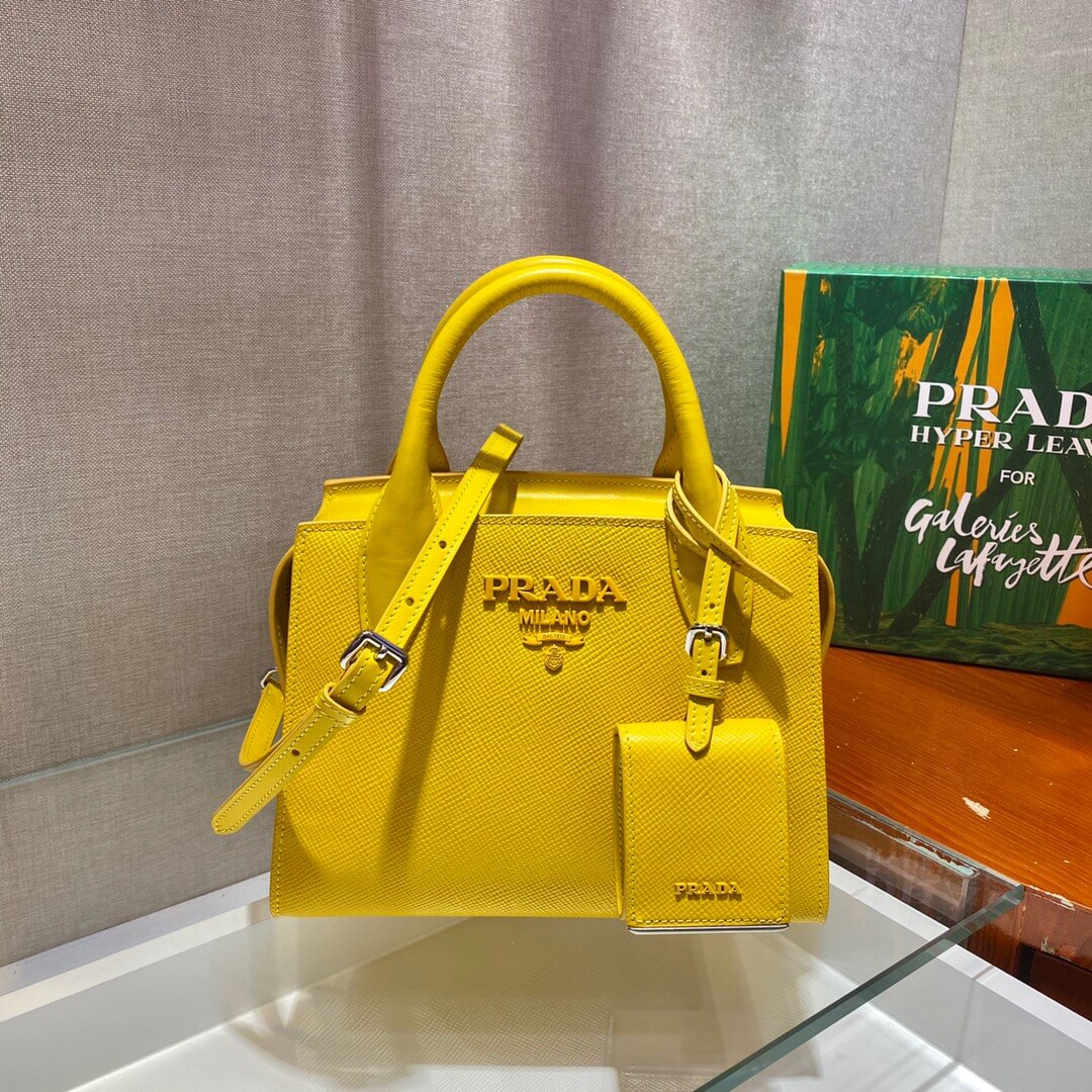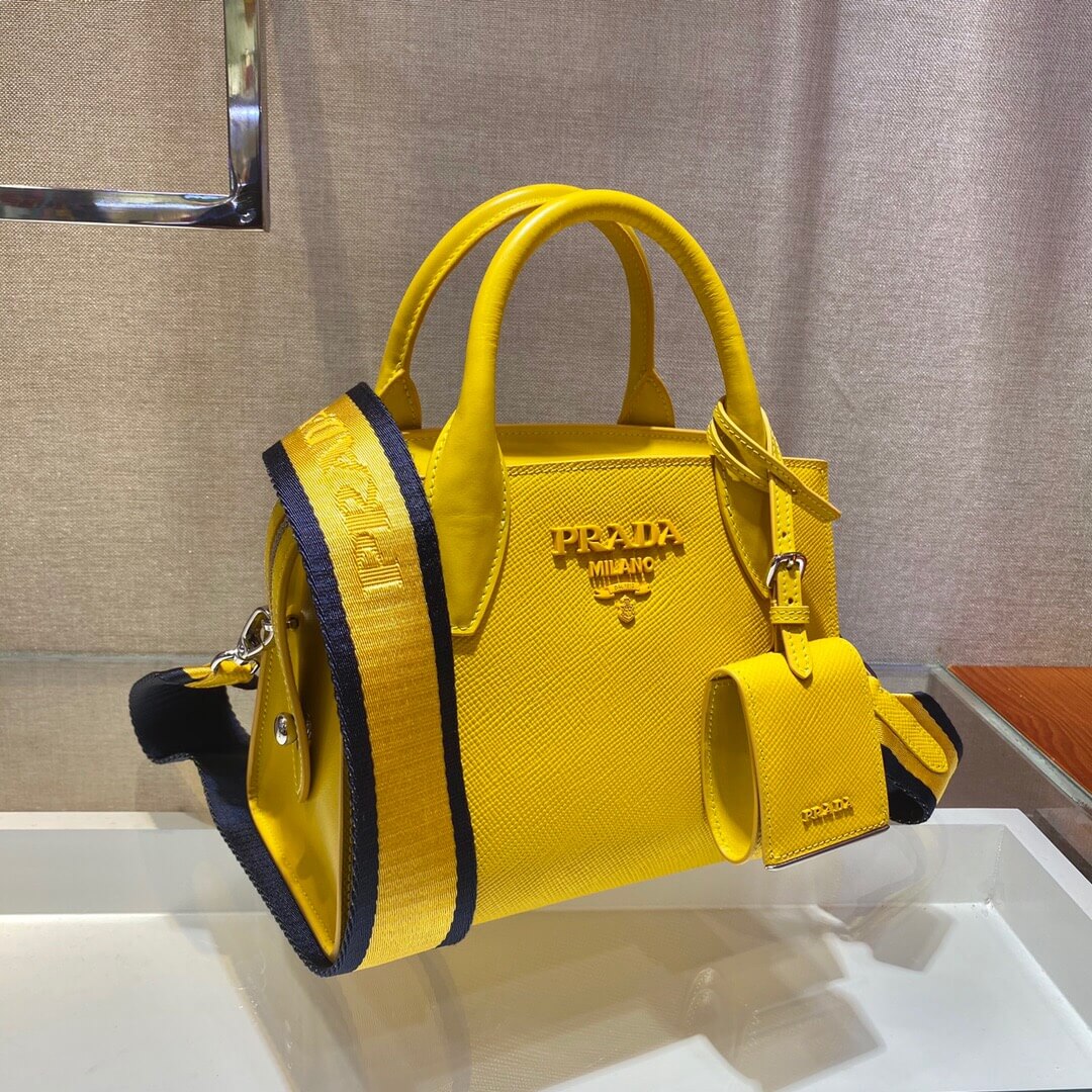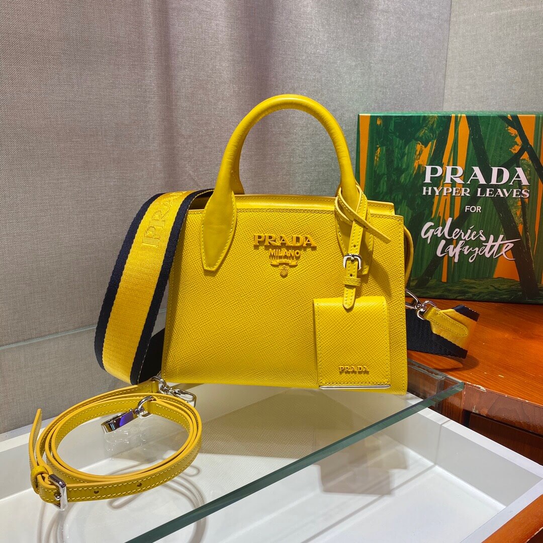 This two-handled Saffiano leather handbag comes with two detachable shoulder straps: in multicolored nylon and in Saffiano. The name tag with tonal logo accents the accessory.