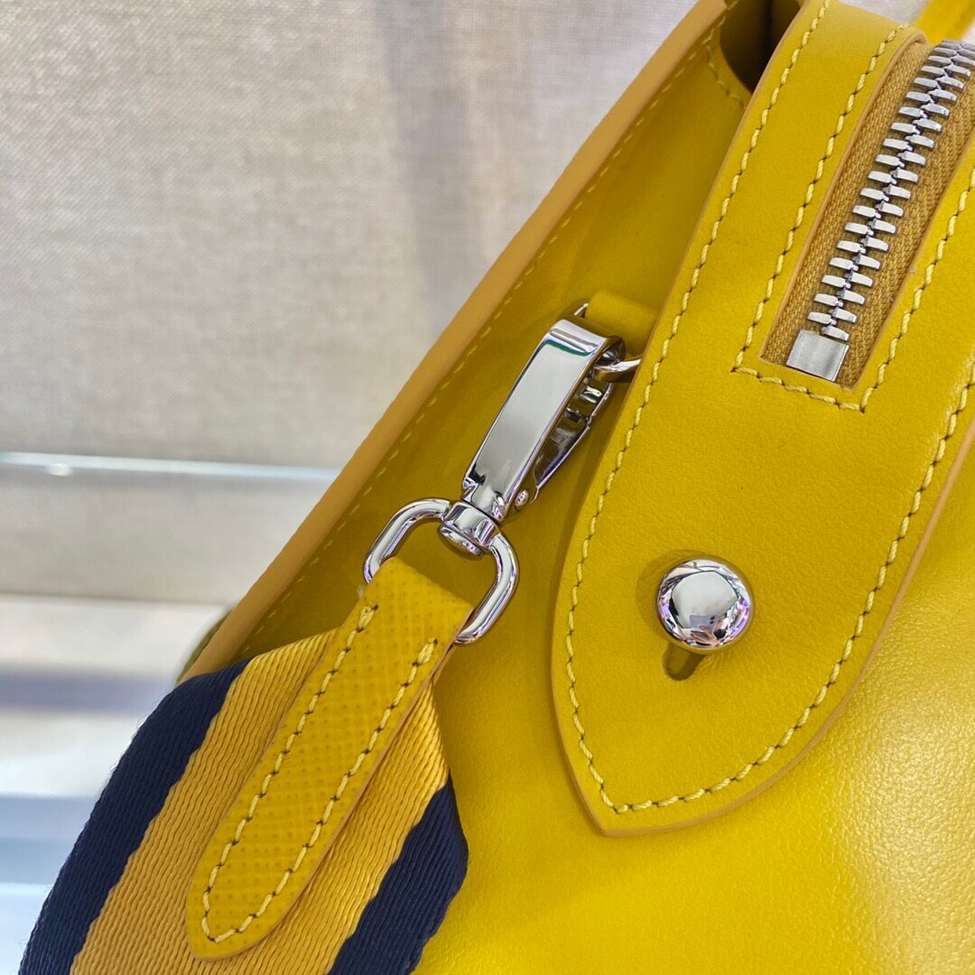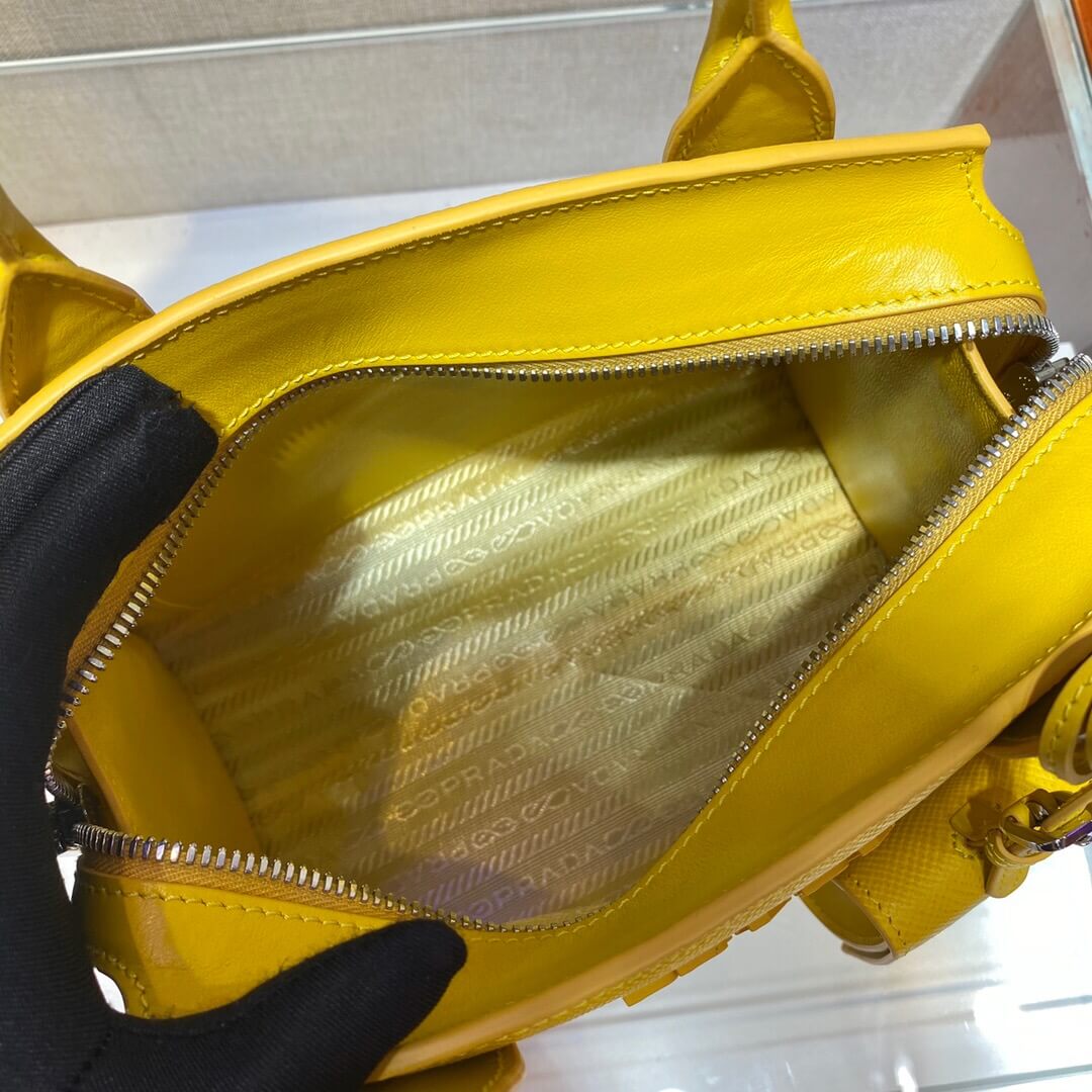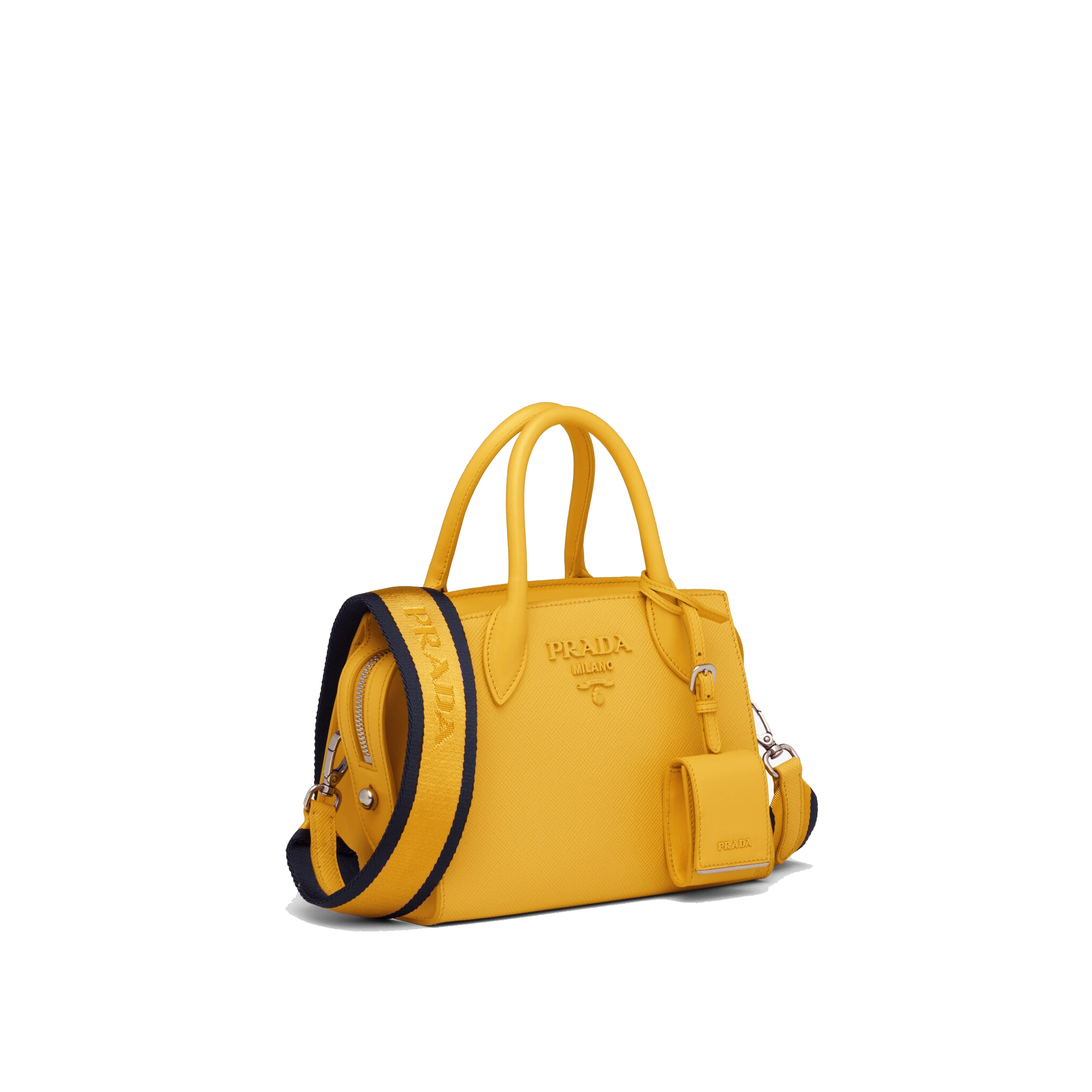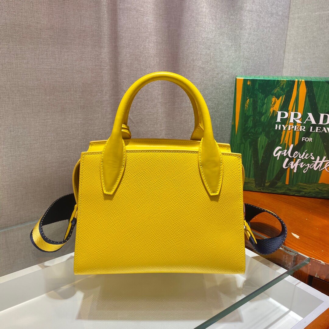 This two-handled Saffiano leather handbag comes with two detachable shoulder straps: in multicolored nylon and in Saffiano. The name tag with tonal logo accents the accessory.