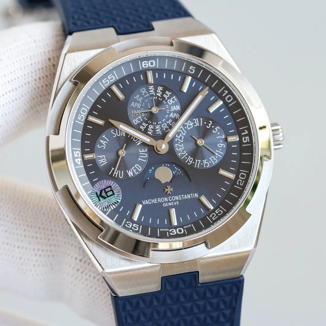 The Vacheron Constantin Overseas Ultra-Thin Perpetual Calendar 4300V/120G-B945 was introduced in 2016. It features an White Gold case with a diameter of 41.5mm, at a height of 8.1mm. It is powered by the automatic caliber 1120 QP/1 which features a perpetual calendar. The dial is Blue. An alligator and rubber strap are included.