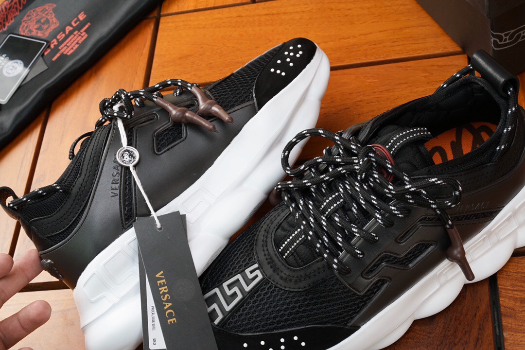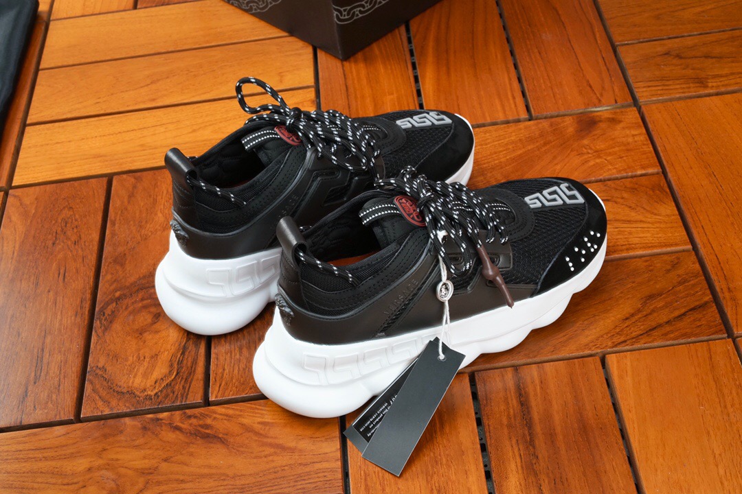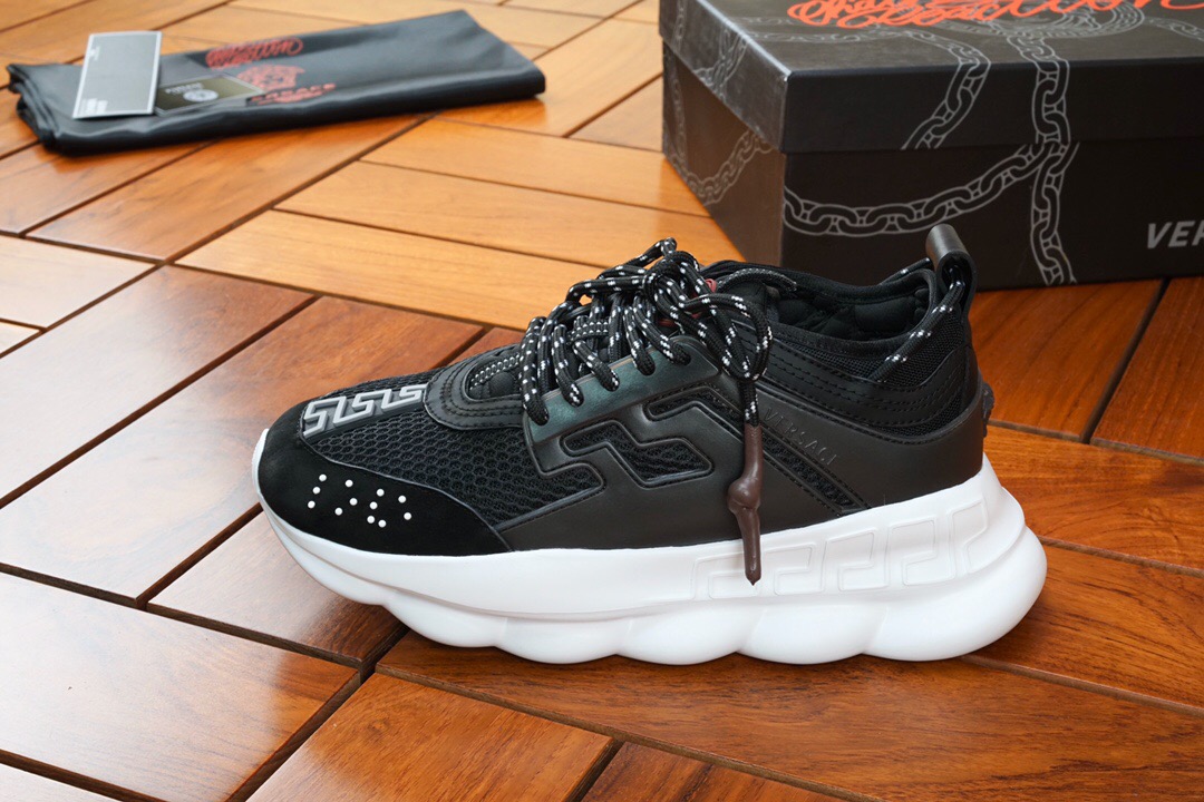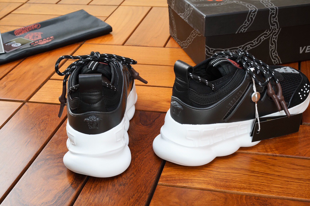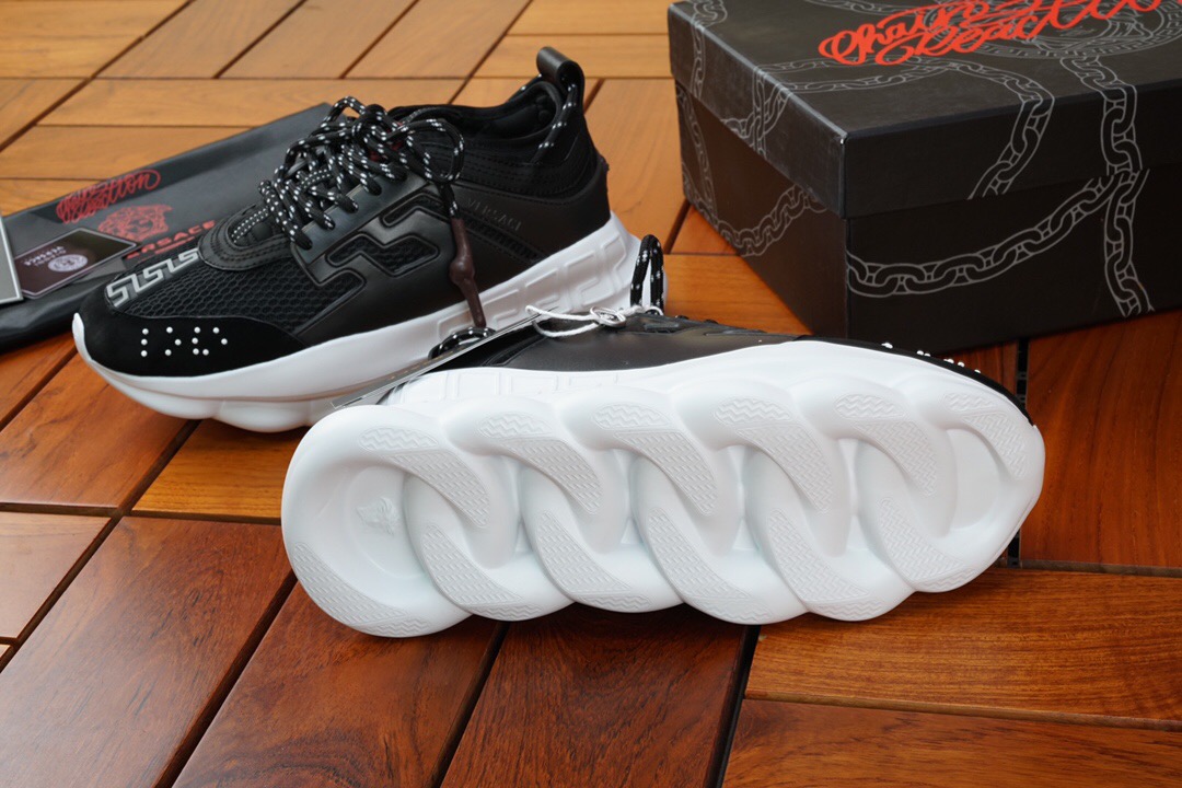 The Chain Reaction, a sneaker that embodies the strongest elements of the Versace identity. Eclectic details create a one-of-a-kind shoe characterized by a lightweight, chain-linked rubber sole that takes inspiration from iconic Versace chain jewellery. Signature elements on the newest Versace sneaker include the iconic Greek Key pattern, the ‘Chain Reaction’ logo patch and braille ‘love’ lettering expressing the concept that love is blind.