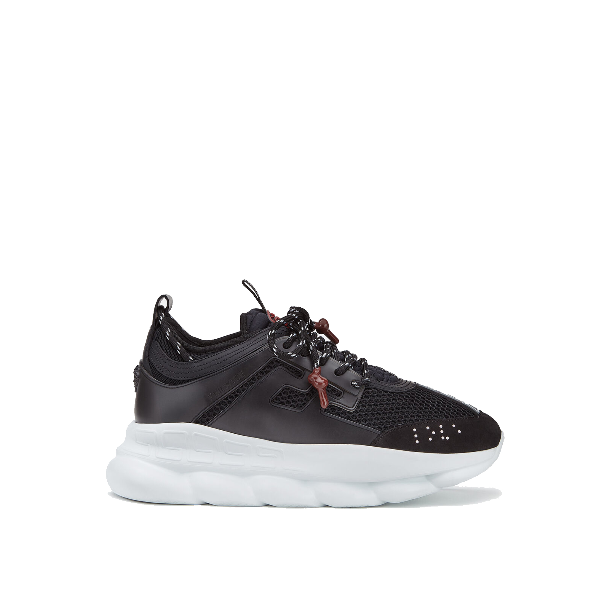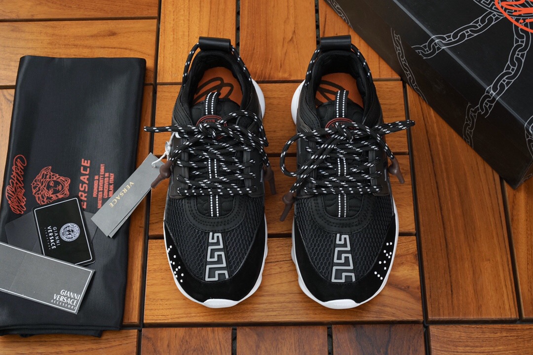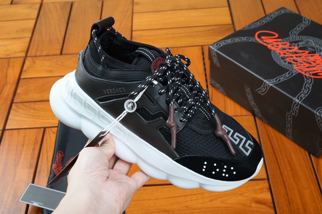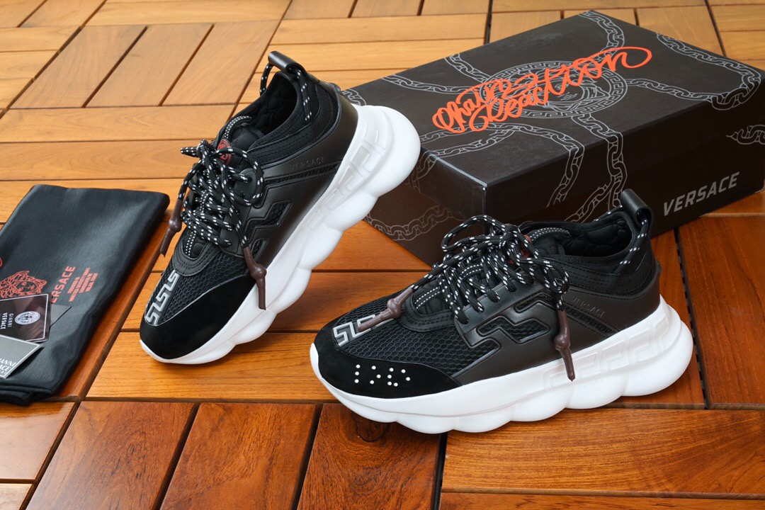 The Chain Reaction, a sneaker that embodies the strongest elements of the Versace identity. Eclectic details create a one-of-a-kind shoe characterized by a lightweight, chain-linked rubber sole that takes inspiration from iconic Versace chain jewellery. Signature elements on the newest Versace sneaker include the iconic Greek Key pattern, the ‘Chain Reaction’ logo patch and braille ‘love’ lettering expressing the concept that love is blind.