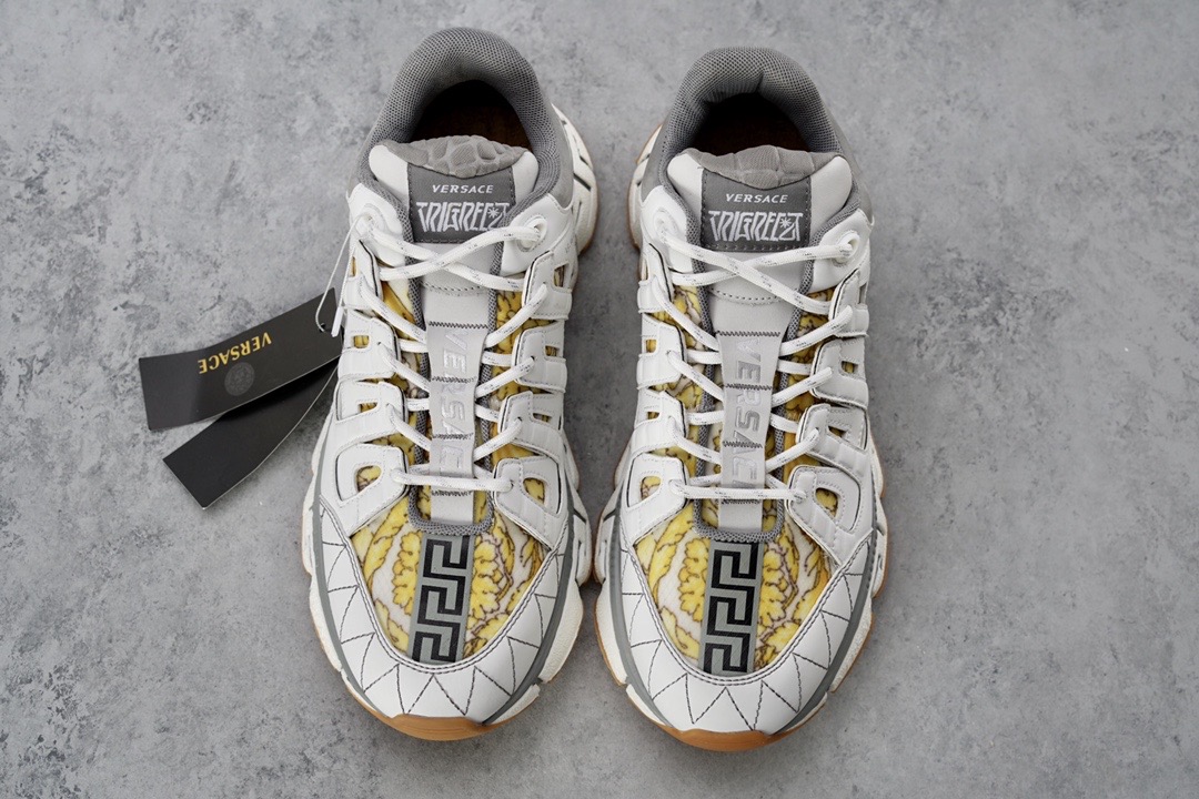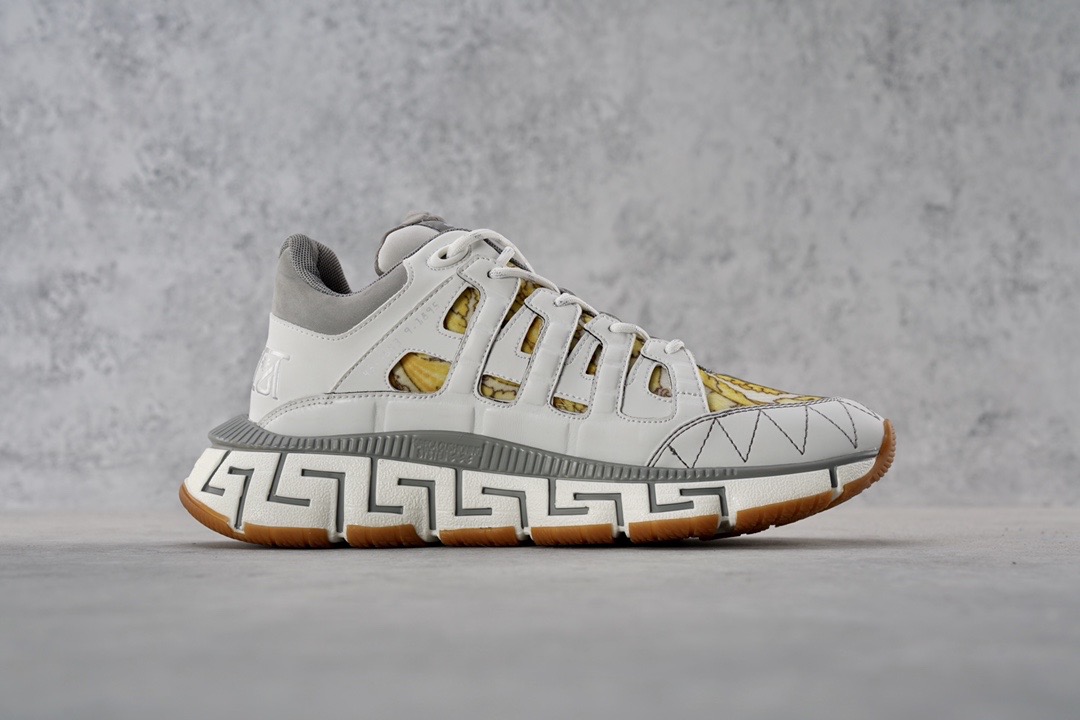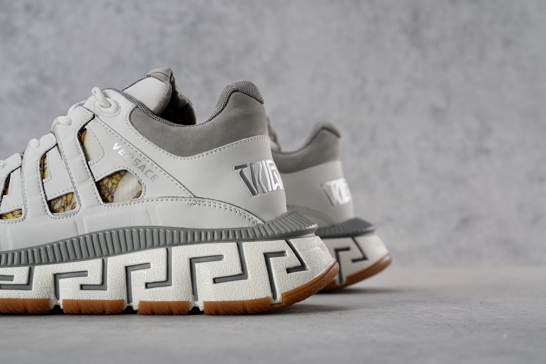 The latest addition to Versace’s coveted trainer family, the Trigreca bring innovation to the brand’s ever-evolving aesthetic. Referencing Versace DNA, the Trigreca feature three prominent Greca executions: the midsole lateral, medial, and the bottom of the outsole. This combination creates the “Greca Cushioning System”. In a subtle nod to Milan, the upper has a discrete print of the city’s coordinates.